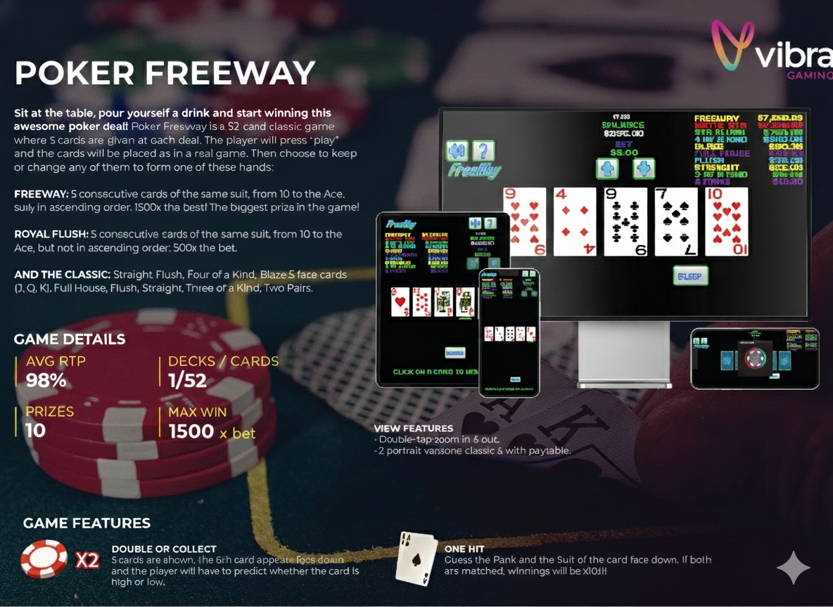 Freeway: 5 consecutive cards of the same suit, from 10 to the Ace, only in ascending order: 1500x the bet! The biggest prize in the game!