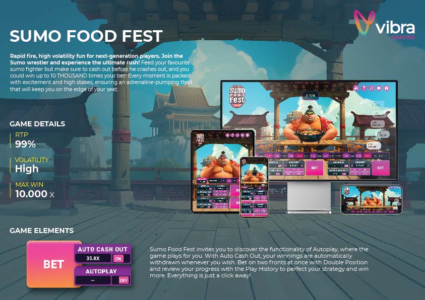 Sumo Food Fest invites you to discover the functionality of Autoplay, where the game plays for you. With Auto Cash Out, your winnings are automatically withdrawn whenever you wish. Bet on two fronts at once with Double Position and review your progress with the Play History to perfect your strategy and win more. Everything is just a click away!